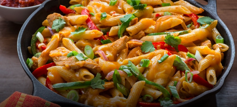 - تُقدم المكرونة مع الفاهيتا ساخنة ومُزينة بالكزبرة الخضراء.